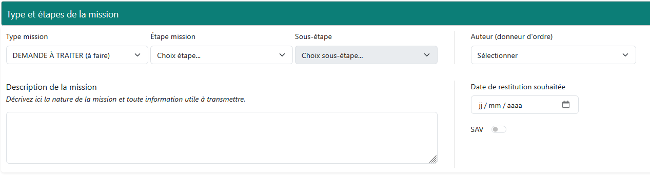 Vous trouverez ci-dessous un tableau des correspondances entre les types, les étapes et leurs sous-étapes. Ces éléments servent à suivre l'avancée d'une mission et sont à maintenir à jour à chaque changement de statut. L'auteur est la personne générant cette mission ; il est possible de modifier cette information ultérieurement.