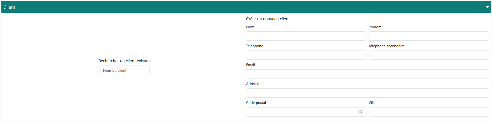 Les sections Client et Véhicule sont similaires et permettent, au choix, de retrouver un Client/Véhicule dans notre base ou de créer de nouveaux éléments. Les informations saisies seront ensuite modifiables dans les interfaces de suivi de missions.