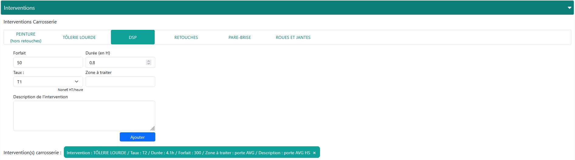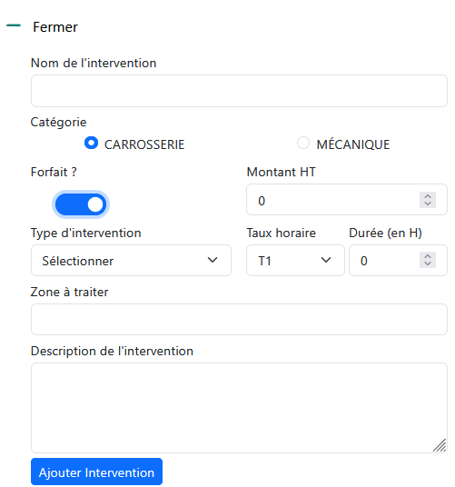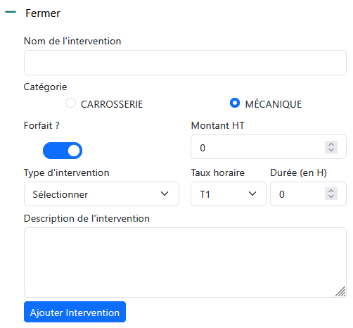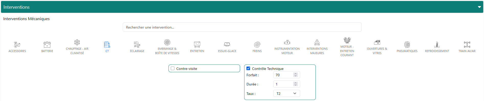Les interventions sont classées suivant leur type (Mécanique, Carrosserie) et regroupées en catégories. Les informations affichées dans les champs de formulaire sont les caractéristiques par défaut de ces interventions selon l'atelier sélectionné. Il est possible de les modifier si cela est nécessaire.