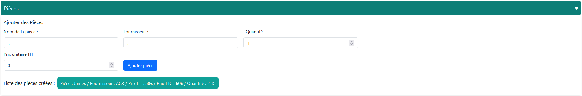 Vous pourrez ajouter ici les pièces nécessaires à la mission. Ces éléments seront ensuite modifiables dans les interfaces de suivi de mission, y compris son statut (A commander, Commandée, Reçue), la date de commande etc...