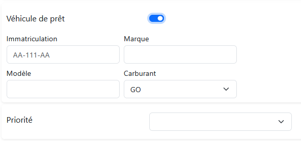 Dans le cas où un véhicule est prêté au client, vous pouvez renseigner ses informations ici.