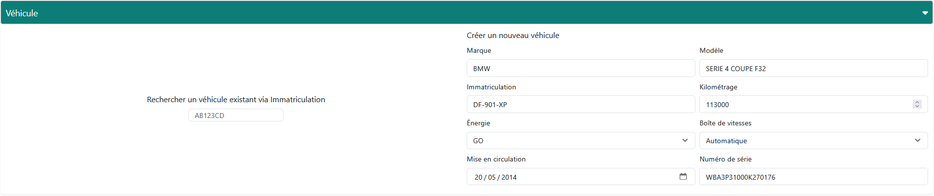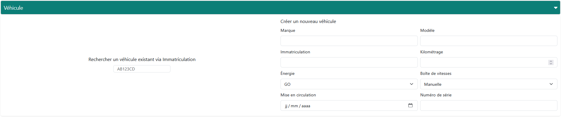 Le véhicule est pré-rempli. Ces informations seront ensuite modifiables dans les interfaces de suivi de mission.
