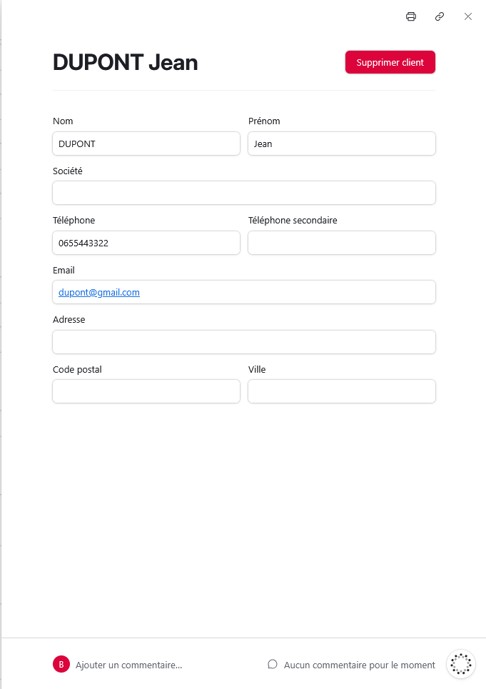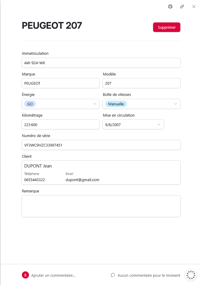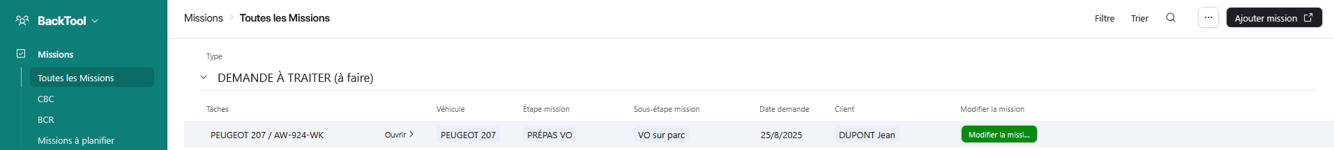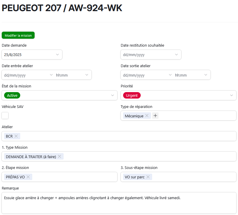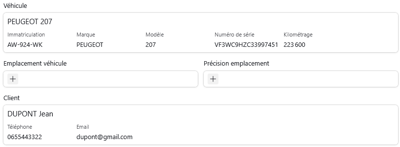 Retrouvez ici les informations concernant le véhicule et le client liés à la mission. Vous pouvez accéder à ces informations et les modifier en cliquant sur l'élément.