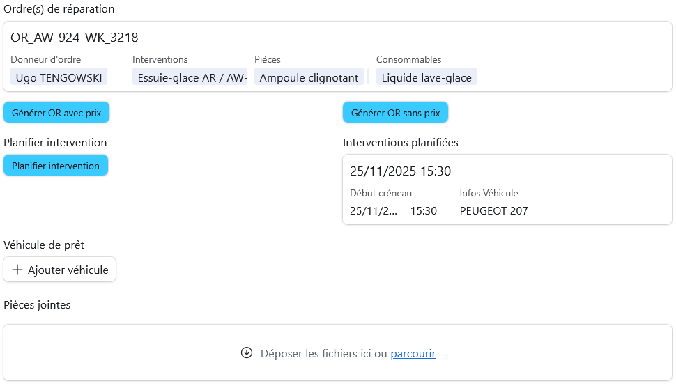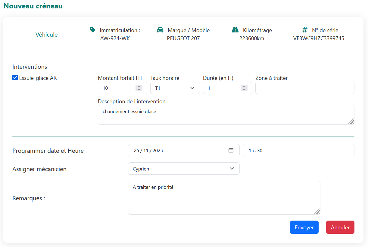 Vous devez ensuite renseigner la date, l'heure, ainsi que le mécanicien assigné à ces interventions.