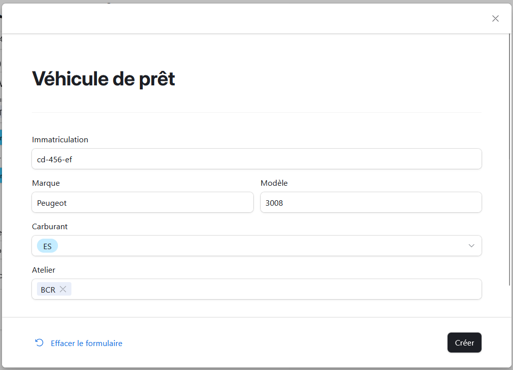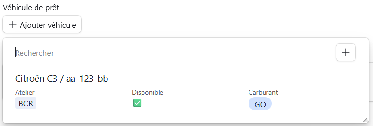 Véhicule de prêt vous permet de choisir un véhicule de prêt dans la liste ou d'en ajouter un nouveau en cliquant sur