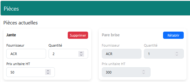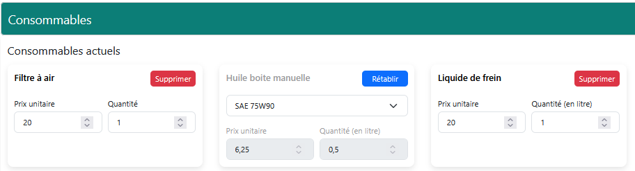 Pour modifier un/plusieurs éléments, il suffit de mettre à jour ses informations directement dans la liste "... actuels", puis de valider le formulaire une fois les modifications terminées.