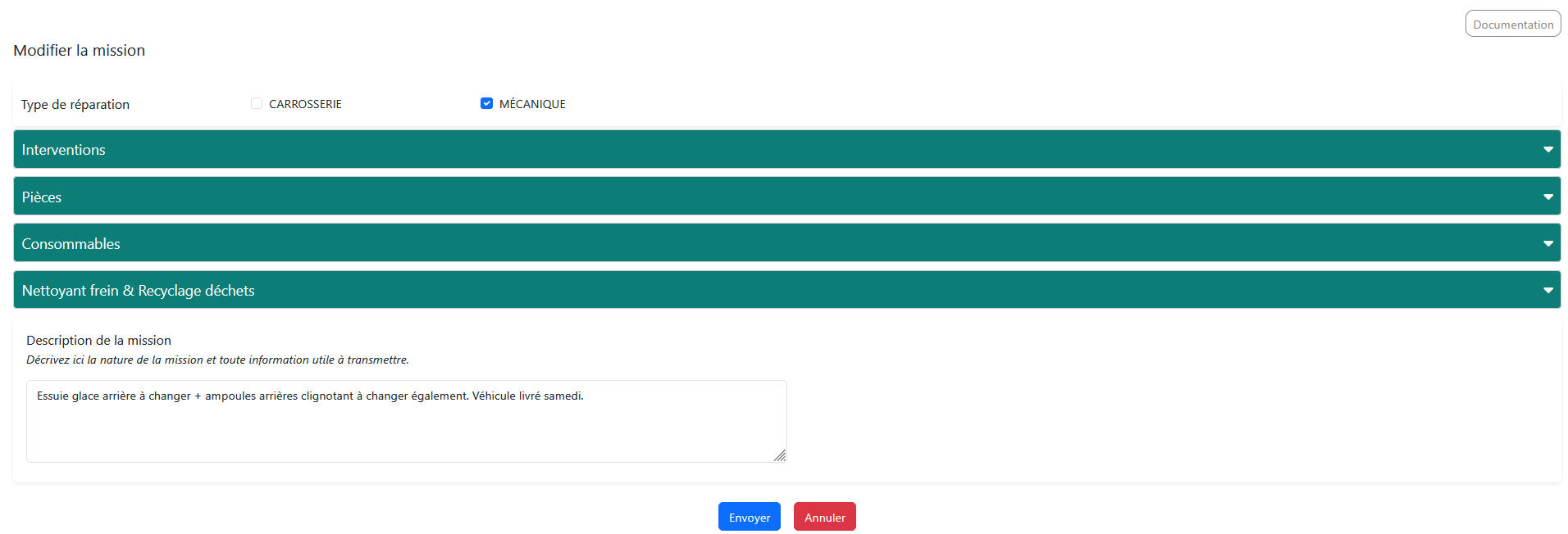 Cette interface vous permet de modifier les informations de la mission, ainsi que renseigner son avancement pour la maintenir à jour.